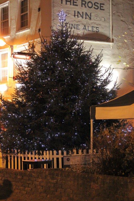 Red and white lights and lots of natural decorations on a 25ft tree for a Town Centre in Oxfordshire.